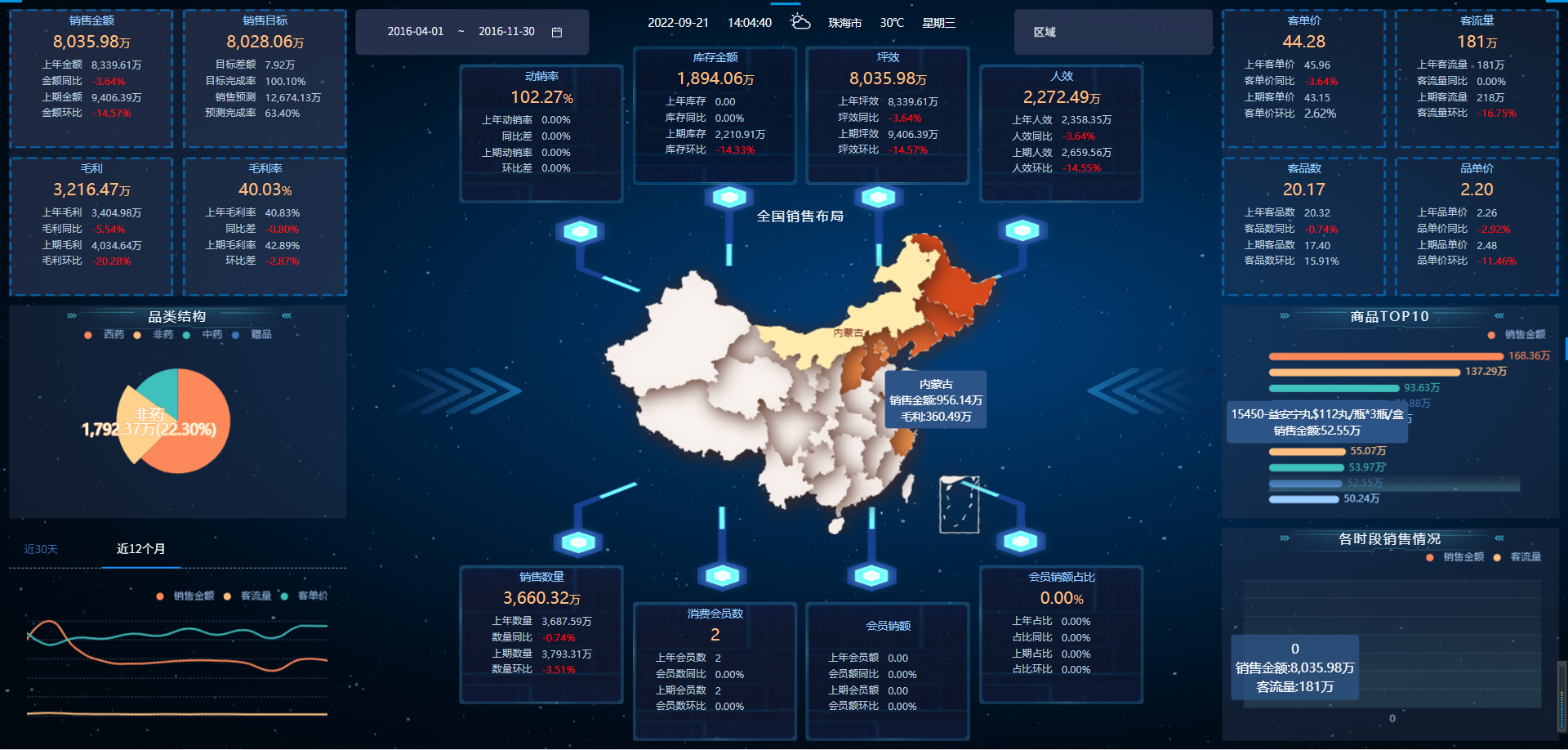 通过会员销售(人)、商品分析(货)、门店分析(场)、销售综合分析和异常预警分析的全面立体的医药数据分析可视化,洞察企业经营,支撑决策、采取行动!