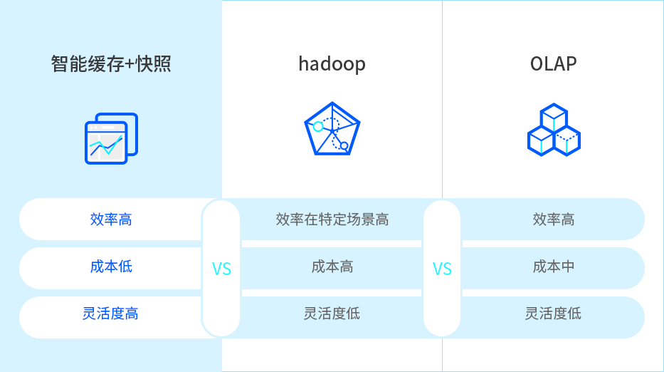 • 当数据记录数达到百万以上时,传统数据库的聚合就会开始慢到影响体验。但是,此时如果使用hadoop等大数据技术,却是杀鸡用牛刀,开发维护成本高且无法发挥其优势。如果用OLAP,需要提前加载计算,虽提高了效率却牺牲了灵活性。